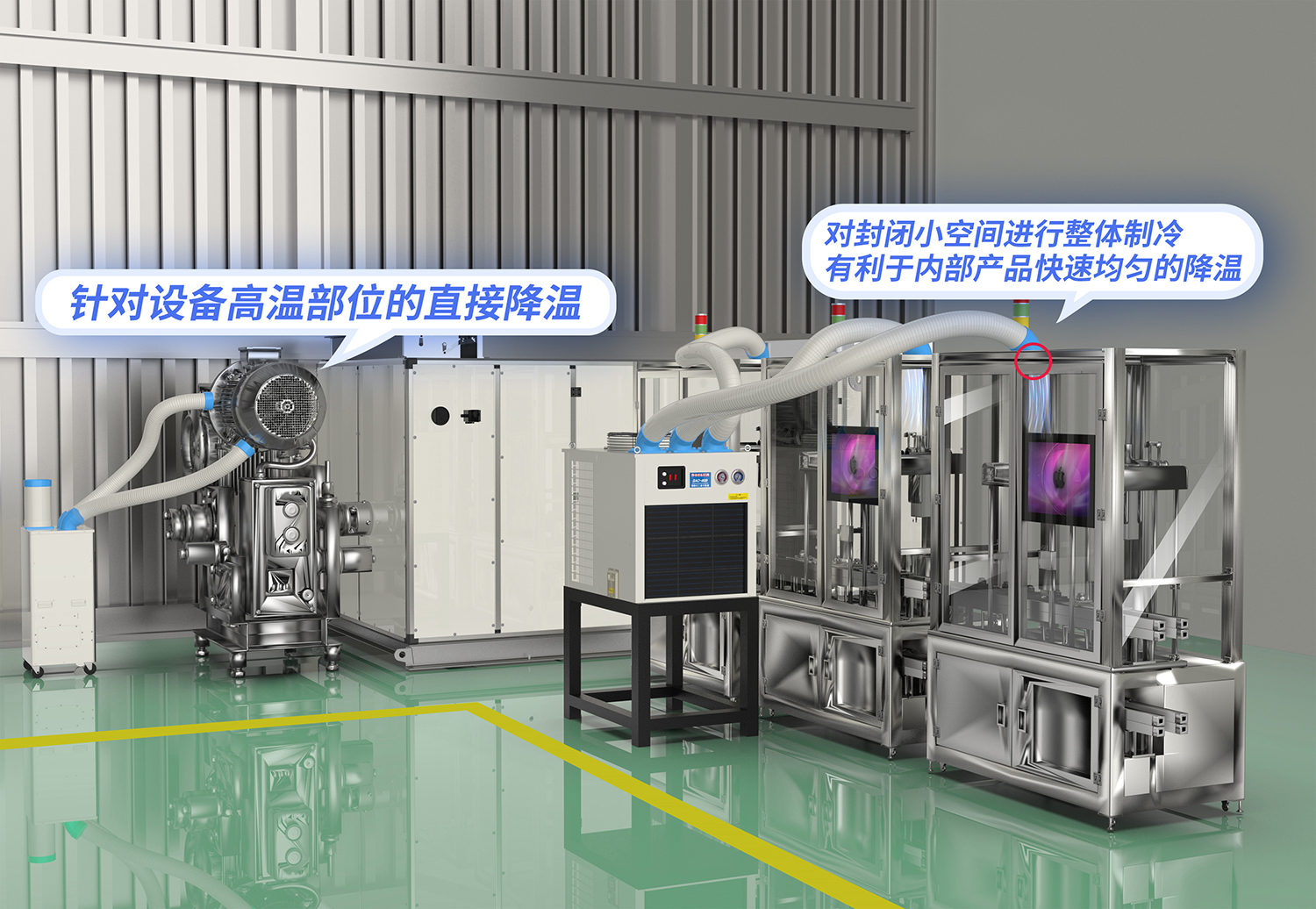 采用壓縮機(jī)和換熱器系統(tǒng)的熱交換進(jìn)行制冷,適用于工業(yè)領(lǐng)域的各種降溫需求。